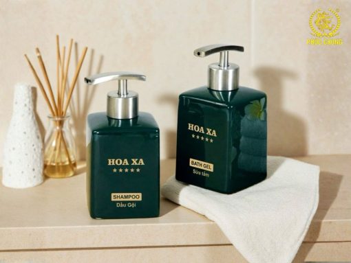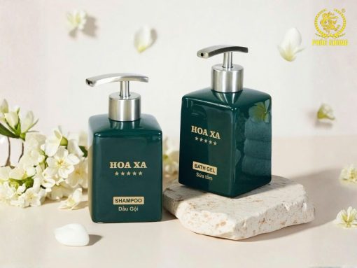 Bộ chai HOA XA với thiết kế vuông bo cạnh, tone xanh đậm sang trọng, mang lại cảm giác cao cấp – sạch sẽ – chuyên nghiệp, phù hợp cho các khách sạn, boutique hotel, resort theo phong cách tinh tế và hiện đại.