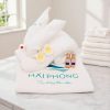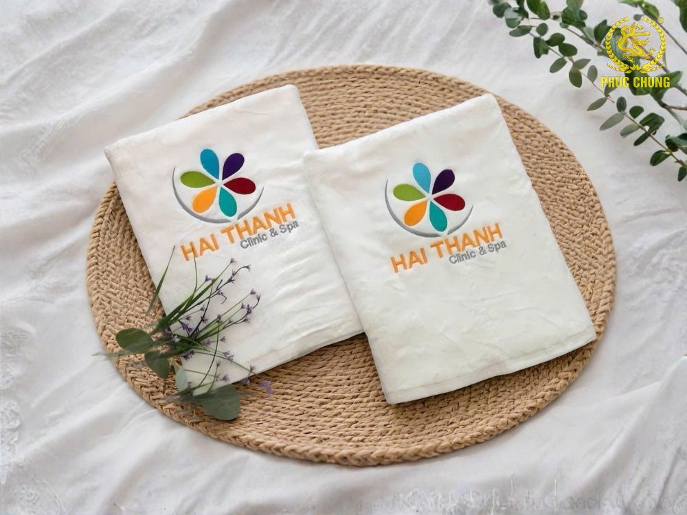 một chiếc khăn mềm mại, sạch sẽ và thêu logo Hai Thanh Clinic & Spa nổi bật